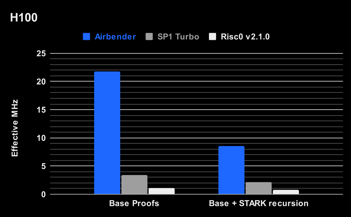 Airbender isn’t just fast. It’s the fastest open-source RISC-V zkVM we have seen. In benchmark tests, Airbender outperforms other leading systems by wide margins. It has achieved: