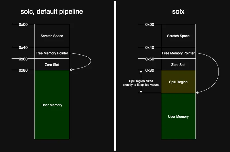 Like the solc --via-ir pipeline, solx resolves the issue by spilling selected stack values into a region of memory that starts right after 0x80 and is sized exactly to fit the spilled variables. The free-memory pointer (0x40) is then bumped so user-level allocations never collide with that region.